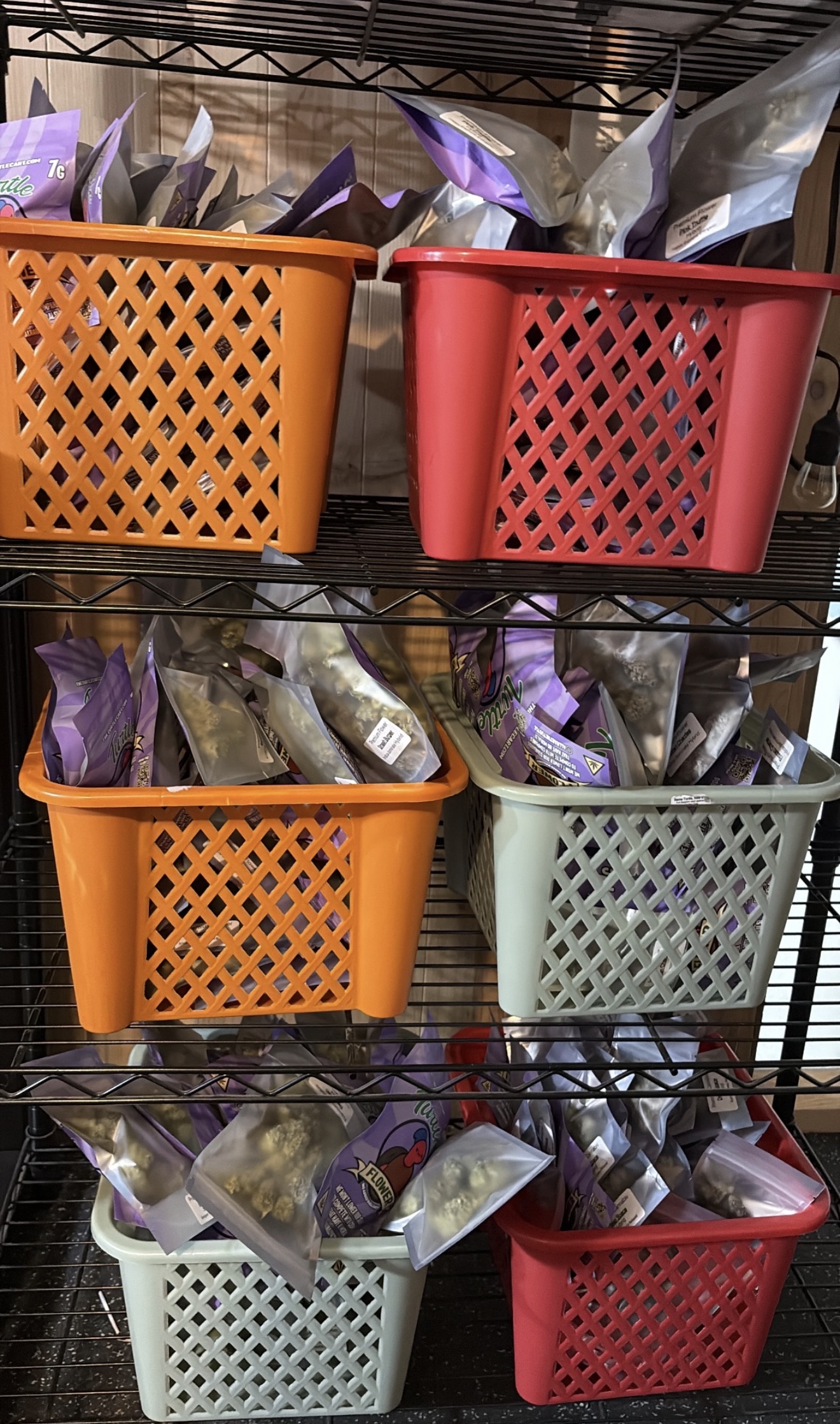 Store flower in its original glass jar in a cool, dark place. Avoid refrigeration or freezing, which can cause trichome brittleness and terpene degradation. A dedicated cannabis humidor or cool closet works well.
